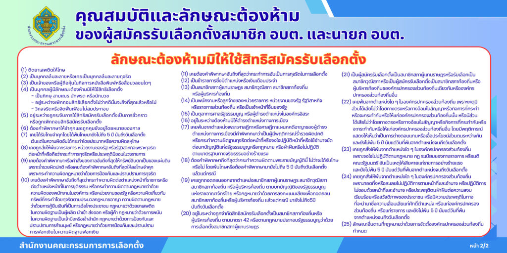 คุณสมบัติและลักษณะต้องห้ามของผู้สมัครรับเลือกตั้งสมาชิก อบต.และนายกอบต. Posted on พฤศจิกายน 7, 2025พฤศจิกายน 7, 2025 by Admin Department